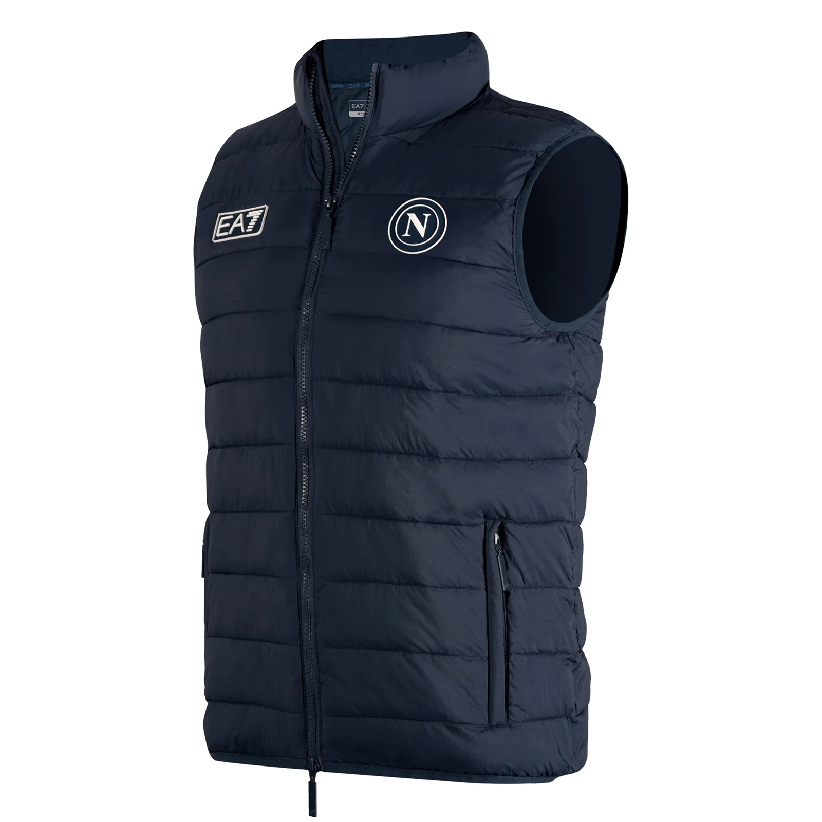 Sul davanti, i loghi SSC Napoli e EA7 sono cuciti con cura, aggiungendo un tocco di classe e orgoglio sportivo. Le tasche laterali con zip offrono uno spazio sicuro per riporre piccoli oggetti, mantenendoli sempre a portata di mano.
