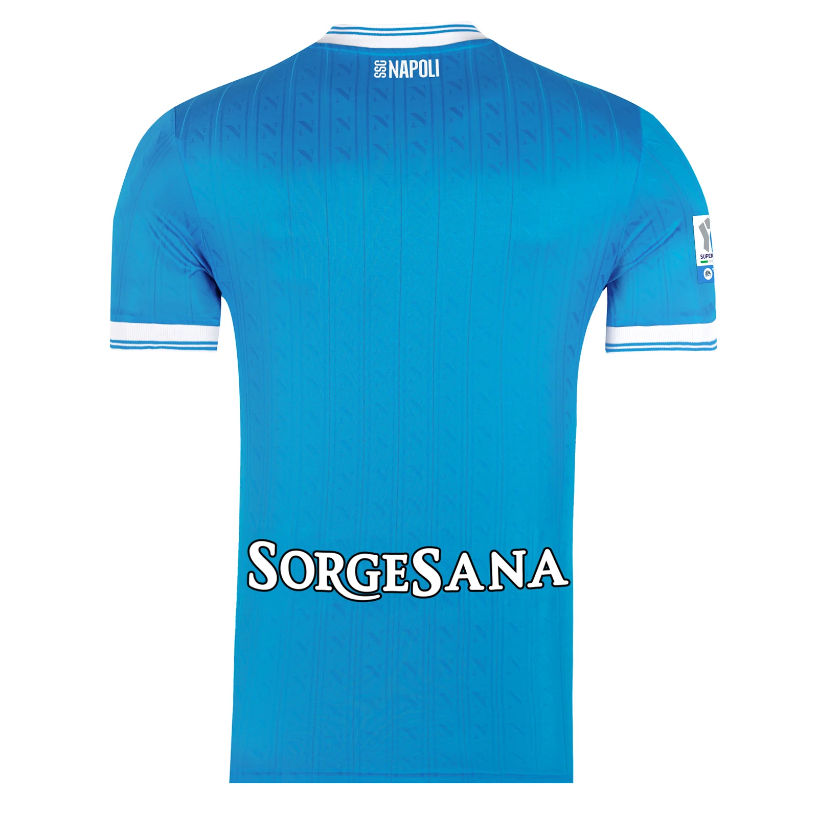 Per lโoccasione della finale, la maglia gara home, elegante omaggio alla tradizione azzurra, รจ arricchita dalla patch ufficiale della Supercoppa Italiana applicata sulla manica e da un transfer esclusivo dedicato al match della finale, elementi che ne certificano lโunicitร e il valore collezionistico.