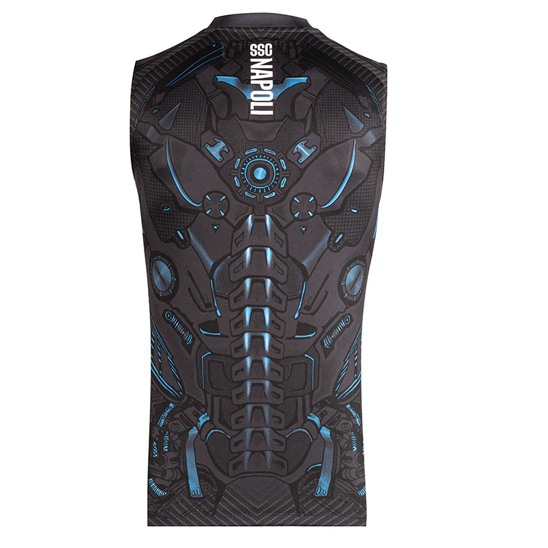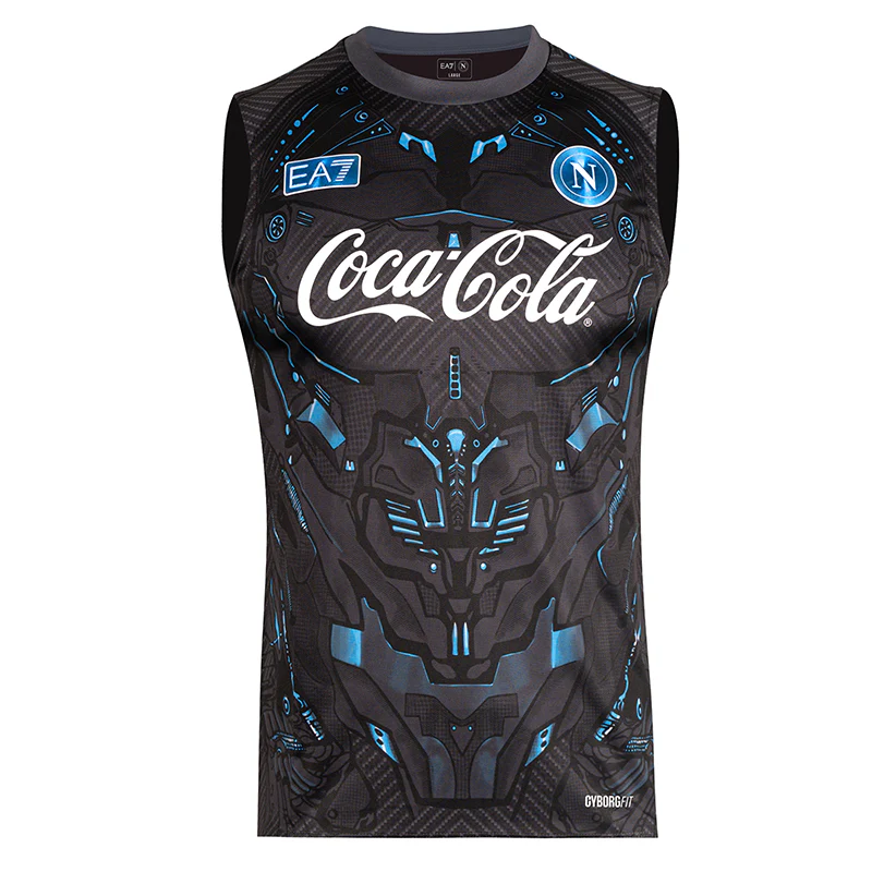 Protagonista del design รจ la trama effetto Cyborg, una grafica geometrica e strutturata tono su tono che richiama le linee metalliche e segmentate delle armature biomeccaniche. Questo pattern dona allo smanicato un aspetto grintoso e allโavanguardia, evocando velocitร , potenza e controllo: qualitร che definiscono lโatleta moderno. La colorazione ebony, profonda ed elegante, esalta lโeffetto high-tech della texture, trasformando un capo da allenamento in una dichiarazione di stile contemporaneo. Il look Cyborg riflette l’identitร di una squadra che guarda al futuro senza dimenticare la propria forza. Sul petto campeggiano con orgoglio i loghi SSC Napoli ed EA7 cuciti, ed il logo Coca-Cola.