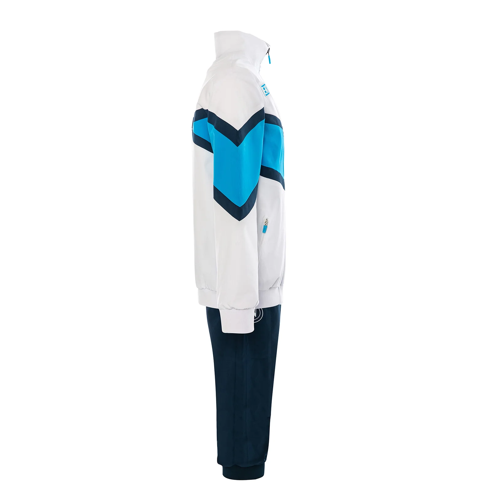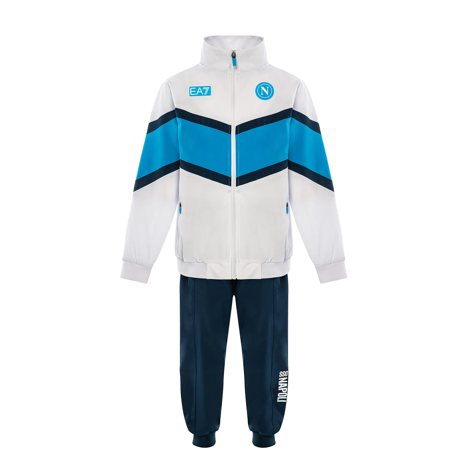 La giacca presenta un originale design geometrico in orizzontale che alterna il colore Bianco allโAzzurro Napoli, per un look moderno, sportivo e pieno di energia. La zip frontale permette di indossarla facilmente, mentre le tasche con chiusura a zip offrono spazio sicuro per piccoli oggetti. I pantaloni blu, comodi e leggeri, garantiscono massima libertร di movimento durante il gioco o le attivitร quotidiane. Anche i pantaloni sono dotati di tasche con zip, pratiche e funzionali. I loghi SSC Napoli e EA7 sono cuciti in azzurro, ben visibili a contrasto sul tessuto, per mostrare con orgoglio i colori della propria squadra.