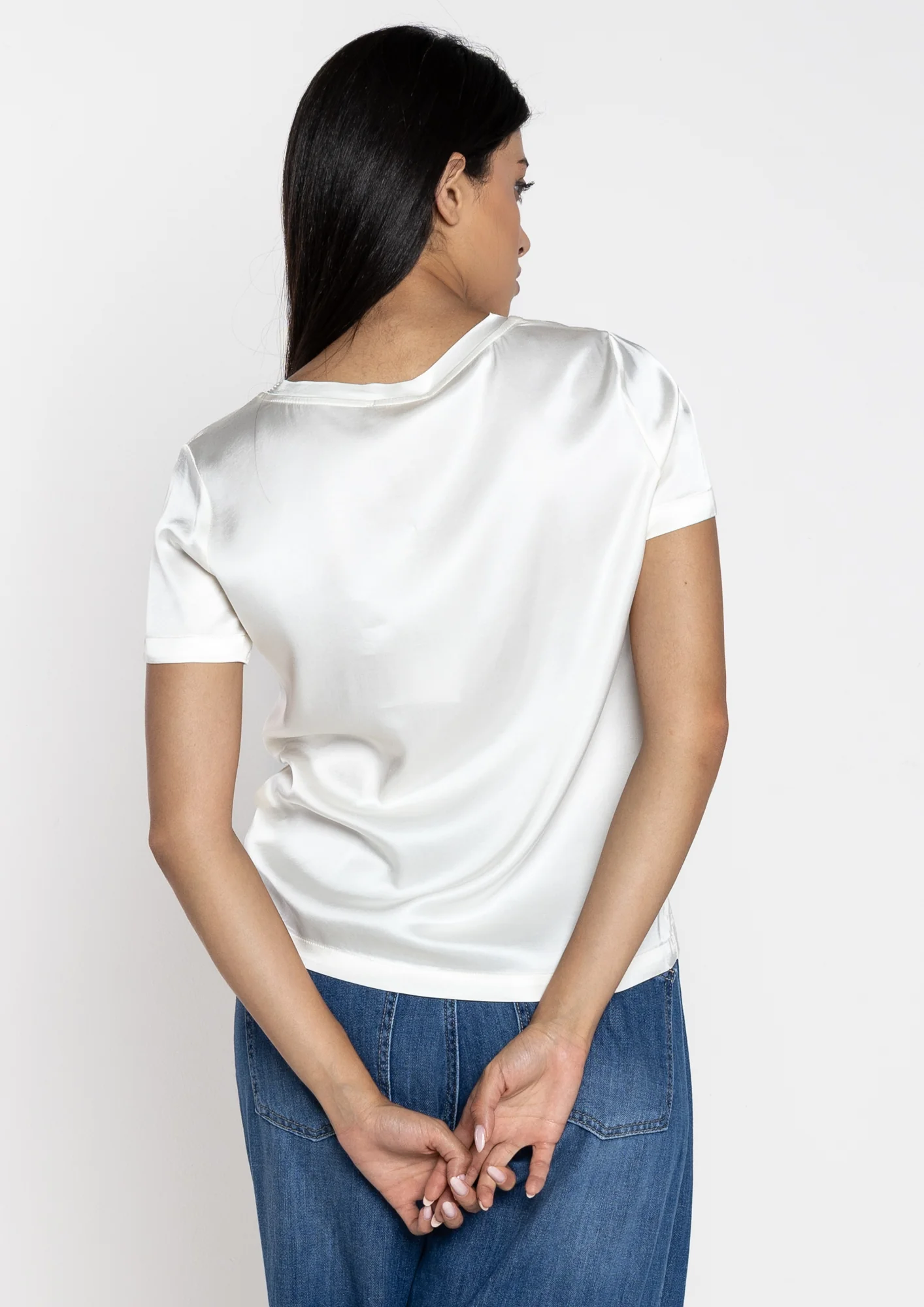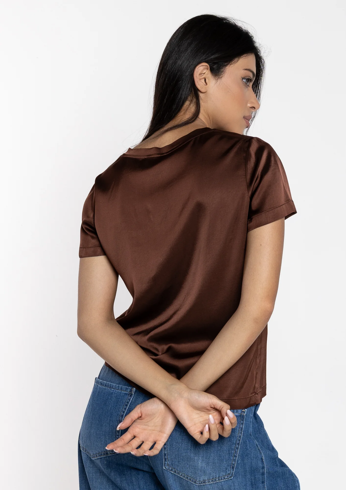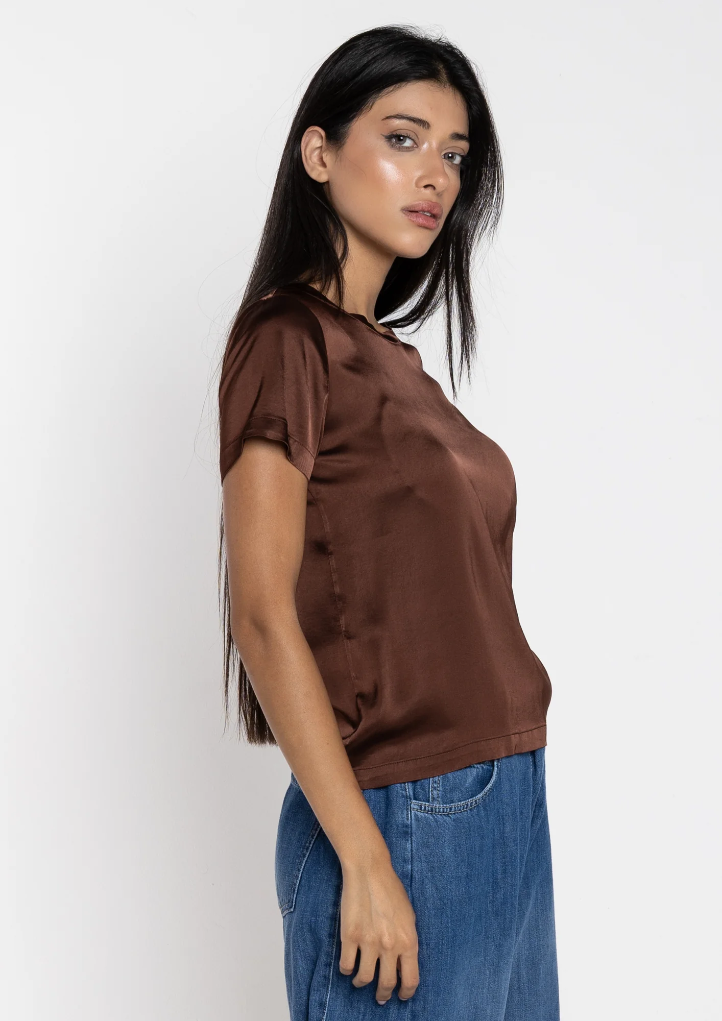 T-shirt donna in raso elegante e confortevole. Realizzata con un tessuto morbido e fluido che si adatta perfettamente al corpo, garantisce libertร di movimento e una vestibilitร impeccabile. Disponibile nei colori choco e avorio, perfetta per creare look sofisticati sia di giorno che di sera. Un capo versatile e raffinato da indossare in ogni occasione.