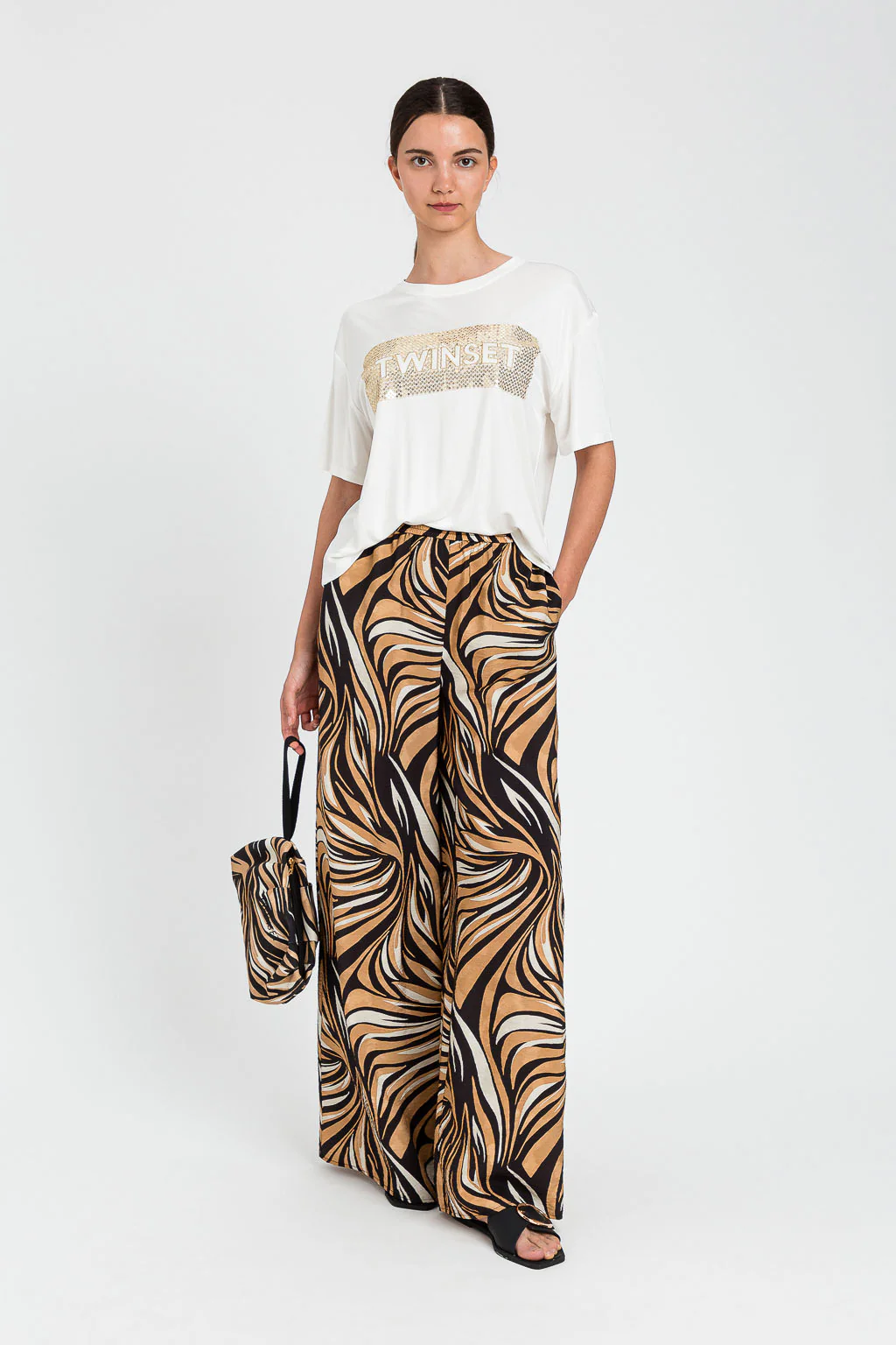 T-shirt donna in viscosa morbida e fluida, disponibile in nero o bianco. Arricchita da un elegante logo con dettagli in paillettes che catturano la luce, perfetta per un look sofisticato e luminoso. Il tessuto delicato garantisce comfort durante tutto il giorno, mentre il design versatile si abbina facilmente a qualsiasi outfit. Ideale per chi ricerca […]