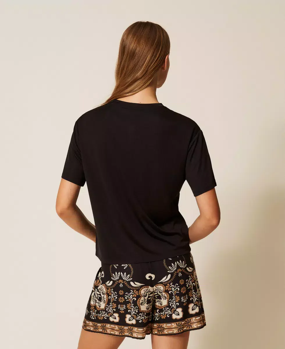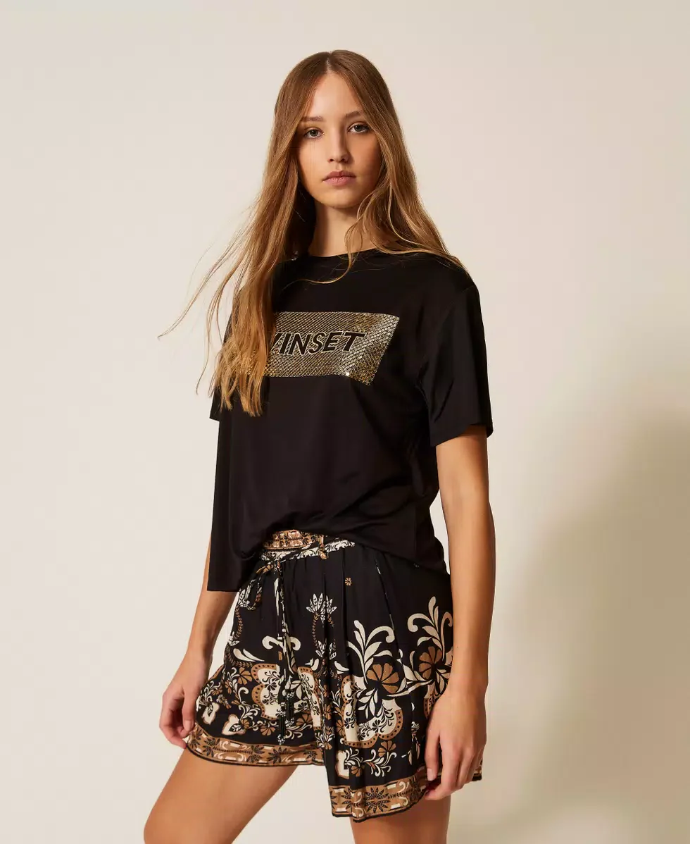 T-shirt donna in viscosa morbida e fluida, disponibile in nero o bianco. Arricchita da un elegante logo con dettagli in paillettes che catturano la luce, perfetta per un look sofisticato e luminoso. Il tessuto delicato garantisce comfort durante tutto il giorno, mentre il design versatile si abbina facilmente a qualsiasi outfit. Ideale per chi ricerca stile e comoditร in un’unica soluzione.