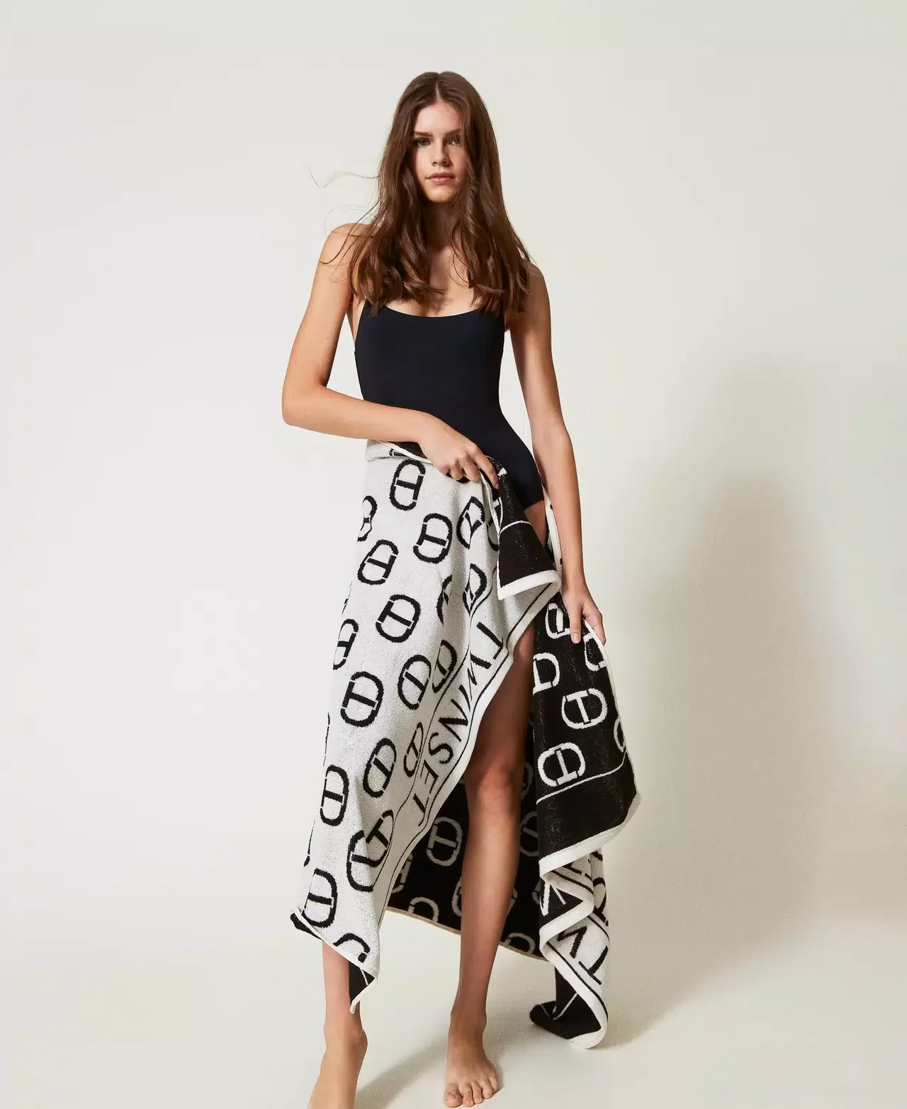 Esclusivo telo mare in spugna jacquard con logo Oval T all over a contrasto e logo lettering ai fondi. Realizzato con tessuti di alta qualitร , questo telo mare offre un comfort lussuoso e un design elegante. Perfetto per un giorno di relax al mare o in piscina, il telo ti farร  sentire come una vera regina.