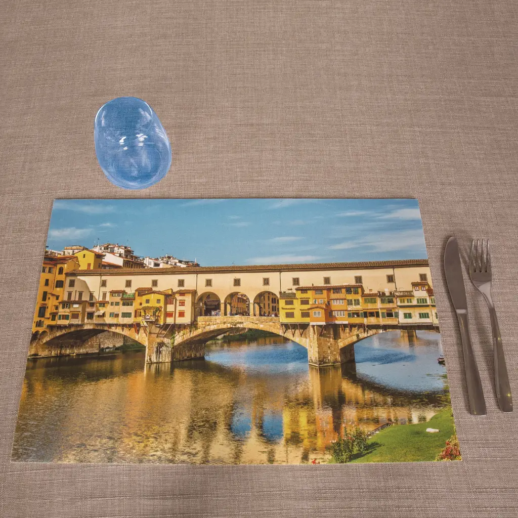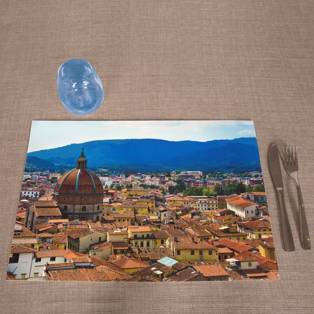 Tovaglietta americana in vinile della linea Cities. Questa tovaglietta è perfetta per la colazione o il pasto perchè facilissima da pulire e da riporre. Grazie a queste sue caratteristiche può anche essere utilizzata come tovaglietta per le ciotole degli animali domestici, perchè facilissime da igienizzare e non assorbono l’acqua. Le tovagliette rappresentano 2 paesaggi tipicamente toscani. Una con Ponte Vecchio, storico e iconico simbolo della città, e una veduta dei tetti del centro di Pistoia e della cupola della chiesa della Madonna dell’Umiltà.
