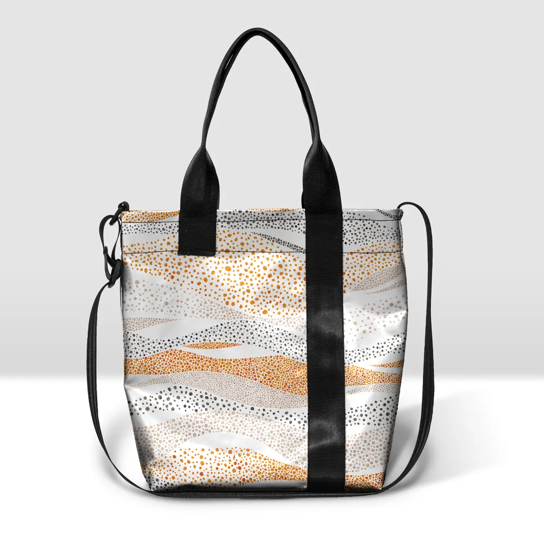 Borsa in banner PVC stampato, con zip pressofusa divisibile e tasca interna.