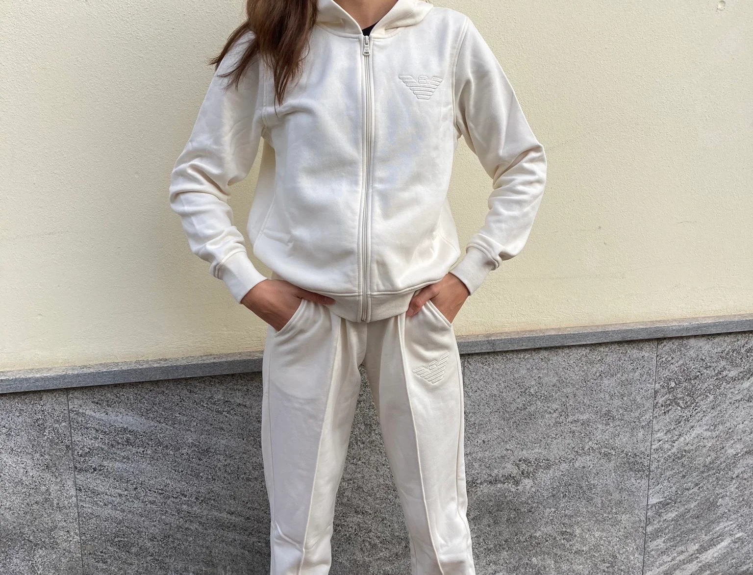 Tuta da donna composta da felpa con cappuccio e con logo laterale, abbinata ad un pantalone con riga frontale e polsini alla caviglia. Vendibili sia come abbinamento, sia spezzata. Contattaci per acquistare solo uno dei due capi. COD. FELPA: EW00392 โฌ129,00 PANTALONE: EW00252 โฌ99,00