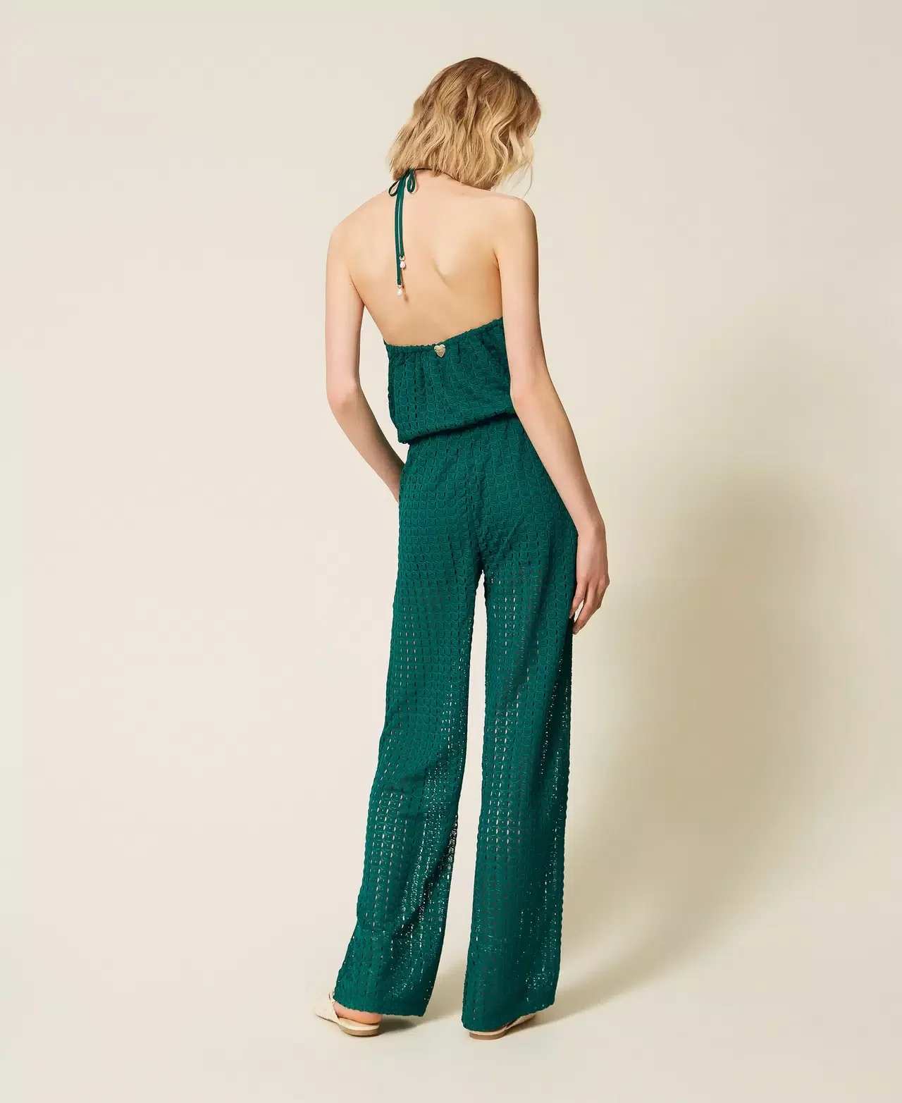 Tuta lunga in jersey con effetto crochet, rivestita internamente in mussola di cotone per massimo comfort. Caratterizzata da scollatura halter con elastico posteriore e collo con laccetti in mussola da annodare dietro. Dettagli raffinati includono un passante in metallo dorato con perla pendente, apertura a V e taglio in vita con elastico interno. I pantaloni ampi presentano tasche laterali inserite e fodera shorts integrata. Completano il design il logo a cuore in metallo sul retro e una linea morbida che valorizza la silhouette.
