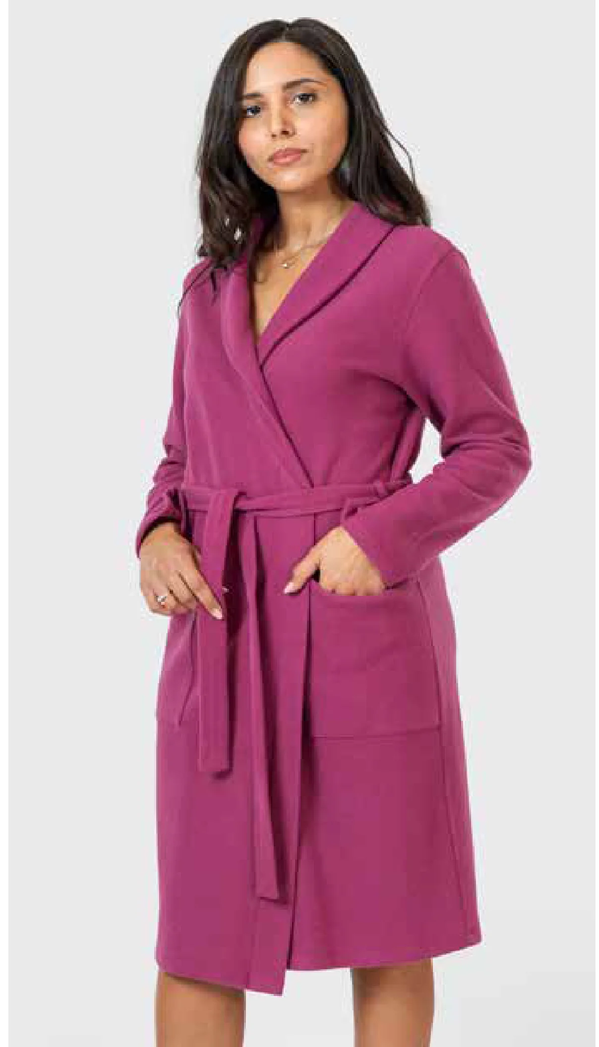 Vestaglia donna in caldo cotone con maniche morbide e tasche laterali con chiusura regolabile.