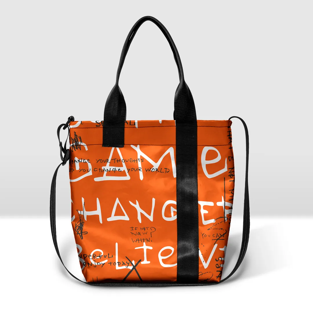 Borsa in banner PVC stampato, con zip pressofusa divisibile e tasca interna.