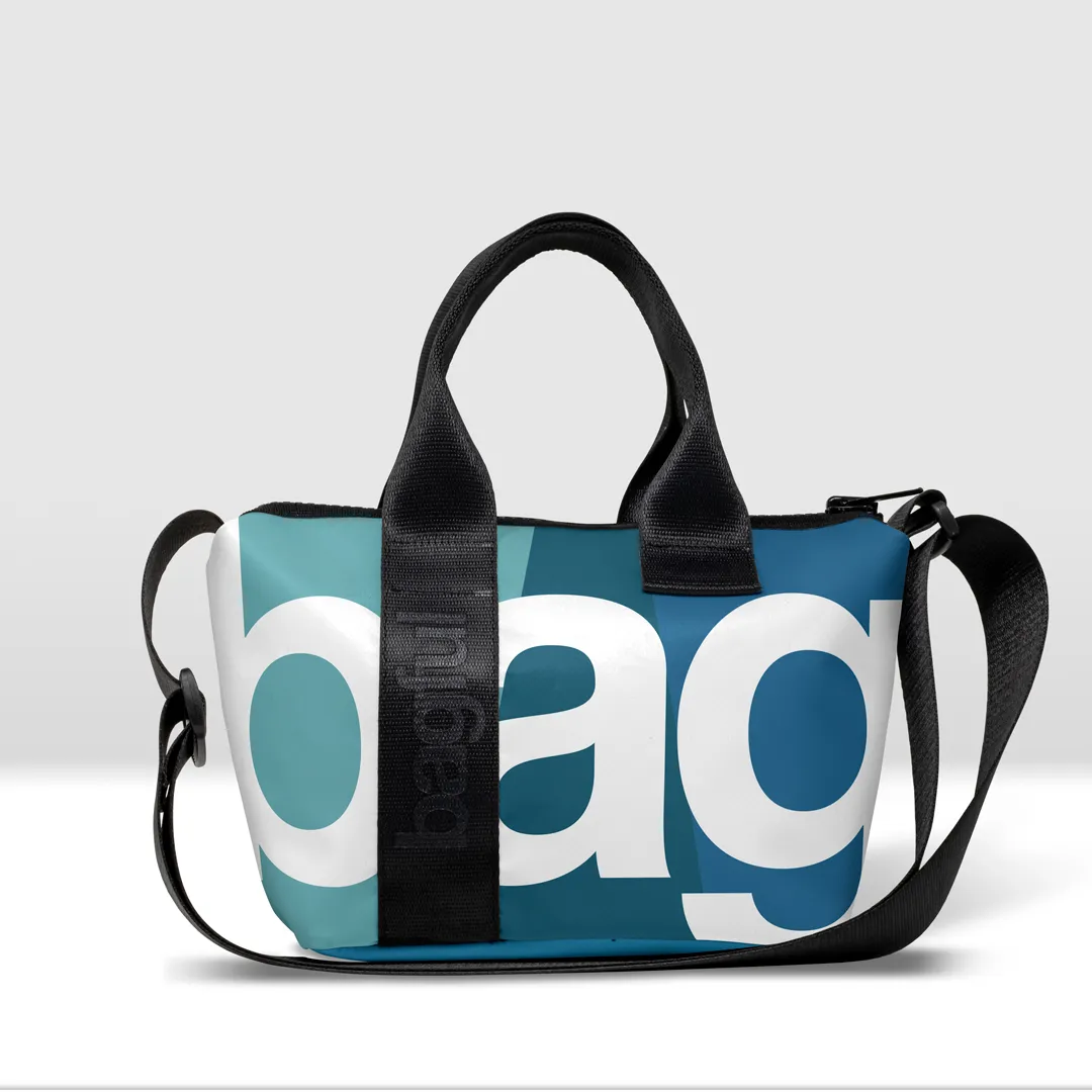 Borsa in banner PVC stampato, zip esterna pressofusa con bordo in tessuto, taschino interno con zip pressofusa, imbottita sul fondo e con possibilità di aggiungere una tracolla. Cinghia prodotta con cintura di sicurezza, brandizzata con incisione laser.