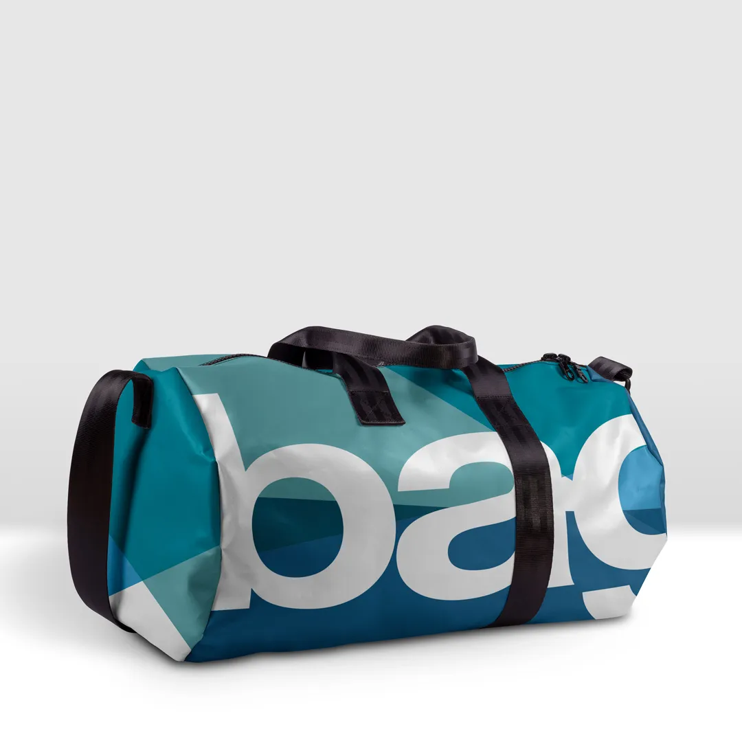 Borsone da palestra in banner PVC 560, stampato, con zip pressofusa, tascone interno con cerniera pressofusa e tracolla.
